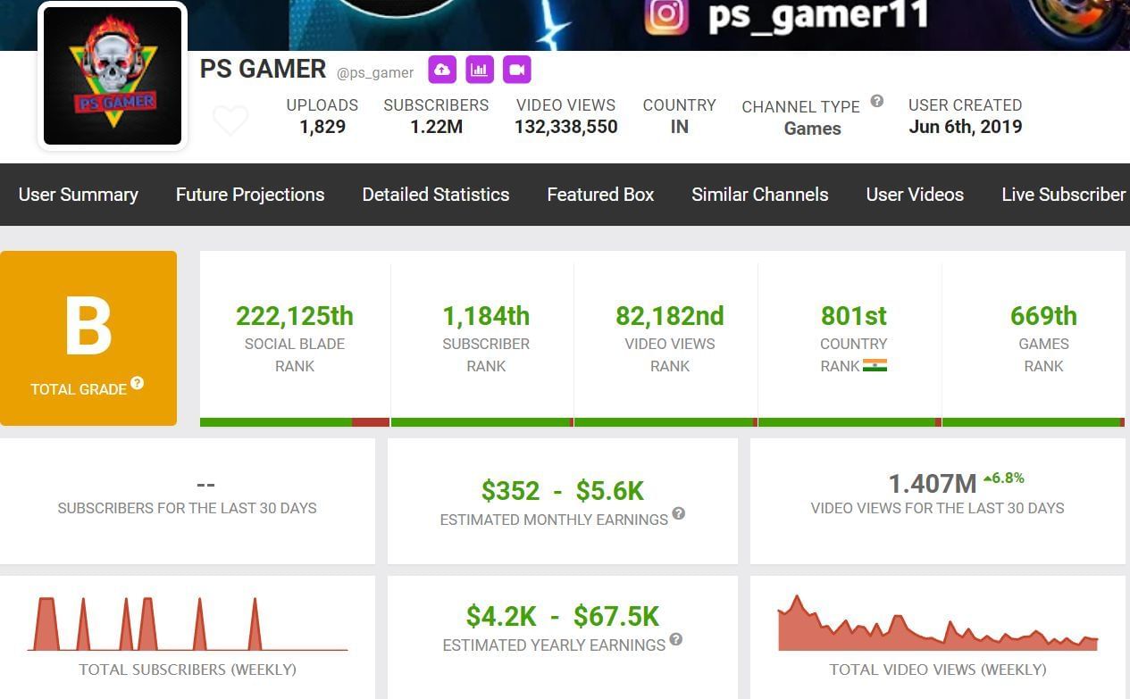 सोशल ब्लेड के अनुसार PS Gamer की यूट्यूब से महीने का $352 से $5.6K कमाते हैं। जबकि एक साल में $4.2K से &67.5K कमाते हैं।