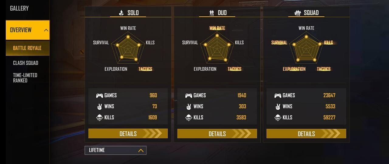 Sooneeta ने फ्री फायर मैक्स में 23647 स्क्वाड मैच खेले हैं और उन्हें 5533 में जीत मिली हैं। इस दौरान उन्होंने 59227 किल्स किये हैं और उनका K/D 3.27 रेश्यो का है। इसके साथ ही उन्होंने डुओ मोड में 1940 मैच खेले हैं और उन्हें 303 में जीत मिली हैं। इसके साथ ही 3583 किल्स कर चुके हैं और उनका K/D 2.19 का है। उन्होंने सोलो मोड में 960 मैचों में से में 73 जीत दर्ज की हुई है। इसके साथ ही उनका K/D 1.81 रेश्यो का है जबकि वो 1609 किल्स कर चुके हैं।