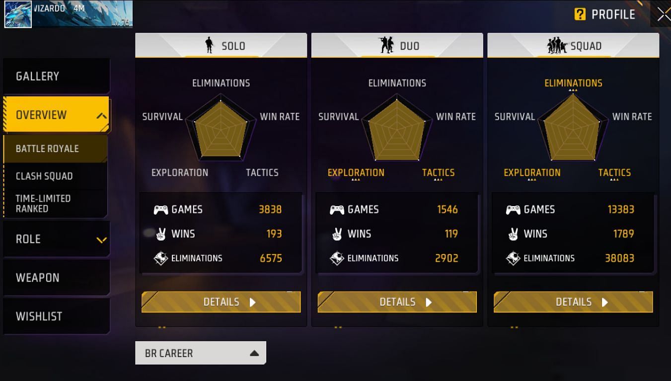 Wizardo Gaming की Free Fire MAX ID 397859383 है और वो 76 लेवल पर हैं। उनका IGN Wizardo 4M है और नीचे उनके बैटल रॉयल स्टैट्स हैं: