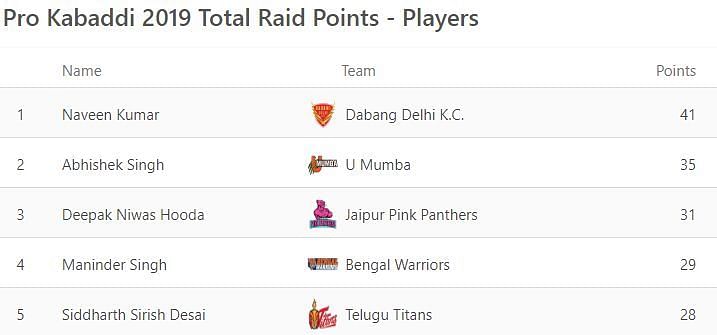 मुंबई लेग में वैसे तो रेडर्स का प्रदर्शन कुछ ज्यादा खास नहीं रहा, लेकिन दबंग दिल्ली के स्टार रेडर नवीन कुमार ने अपने प्रदर्शन से सभी को काफी प्रभावित किया। इस सीजन में अबतक खेले गए 4 मैचों में नवीन के नाम 41 रेड पॉइंट हैं, जिसमें 3 सुपर 10 शामिल हैं। इसके अलावा जयपुर के कप्तान दीपक निवास हूडा ने भी टॉप 5 में जगह बनाई। वो 31 रेड पॉइंट के साथ तीसरे स्थान पर हैं।