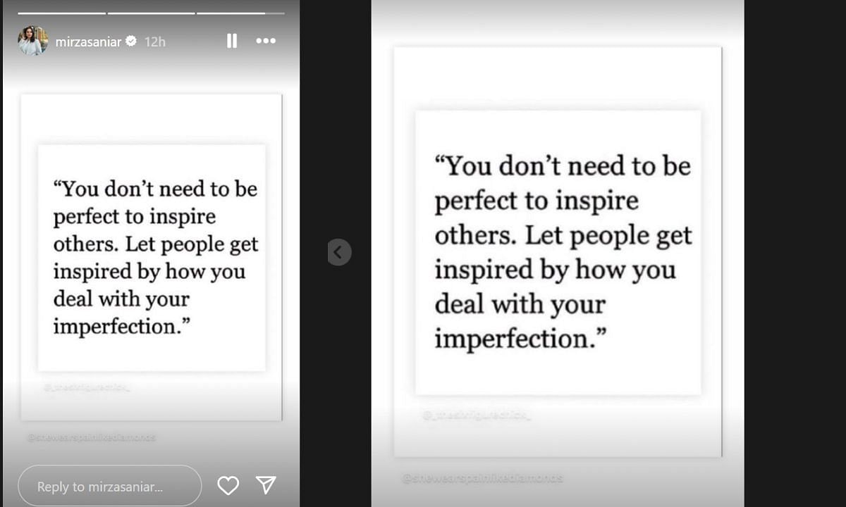 सानिया ने अपनी इंस्टाग्राम स्टोरी में shewearspainlikediamonds इंस्टाग्राम पेज का एक क्वोट शेयर किया है, जिसमें इंग्लिश में लिखा है (You don't need to be perfect to inspire others. Let people get inspired by how you deal with your imperfection), इसका हिंदी में मतलब है कि दूसरों को प्रेरित करने के लिए आपको परफेक्ट होने की आवश्यकता नहीं है, लोगों को इस बात से प्रेरित होने दें कि आप अपनी अपूर्णता से कैसे निपटते हैं।
