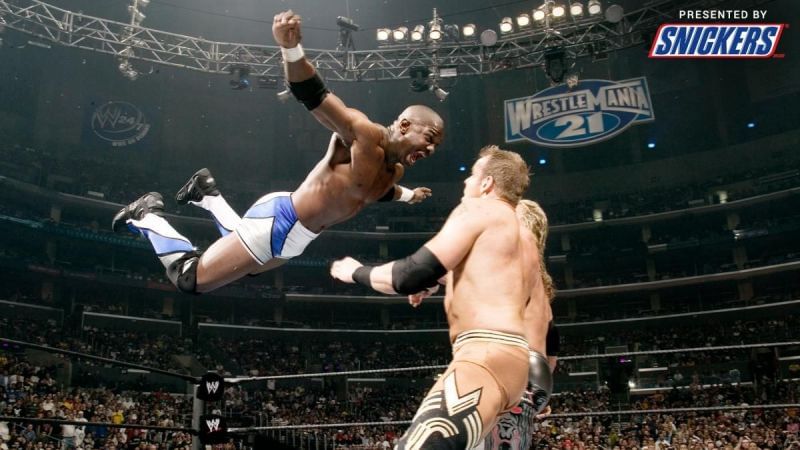 #4 शेल्टन बेंजामिन का लैडर के ऊपर से क्लोथलाइन देना - रैसलमेनिया 21