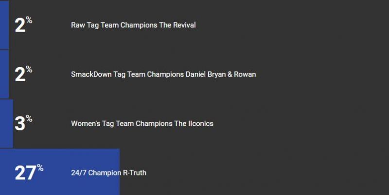 आर-ट्रुथ को इस पोल में 27% वोट मिले हैं, वहीँ 21% वोटों के साथ सैथ रॉलिंस ठीक उनके पीछे हैं। इस पोल के जरिए यह बात स्पष्ट हो गई कि आर-ट्रुथ इस वक़्त WWE के सबसे लोकप्रिय चैंपियन हैं और यह चीज आर-ट्रुथ के 24/7 चैंपियन के रूप में मजेदार हरकतों के कारण ही संभव हो पाई है।