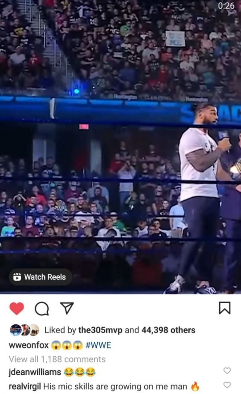 पूर्व न्यू वर्ल्ड ऑर्डर के सदस्य वर्जिल (Virgil) ने रोमन रेंस (Roman Reigns) के माइक स्किल की तारीफ की है। Money in the Bank में यूनिवर्सल चैंपियनशिप डिफेंड करने के बाद रेंस ने WWE यूनिवर्स को ब्लू ब्रांड में संबोधित किया था। वर्जिल ने इस चीज पर अपनी प्रतिक्रिया दी। WWE ने फॉक्स ऑफिशियल इंस्टाग्राम पर रोमन रेंस का पोस्ट किया था। इस पर वर्जिल ने कमेंट किया और रोमन रेंस की सराहना की।