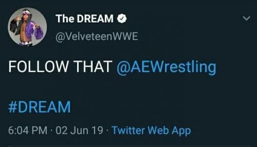 NXT सुपरस्टार वेल्वेटीन ड्रीम ने NXT टेकओवर खत्म होने के बाद ऑल एलीट रैसलिंग को कड़ी चुनौती दी। उन्होंने ट्विटर पर AEW को टैग करते हुए NXT जितना अच्छा शो देने के बारे में बात की। कुछ समय बाद उन्होंने अपने इस ट्वीट को डिलीट कर दिया।
